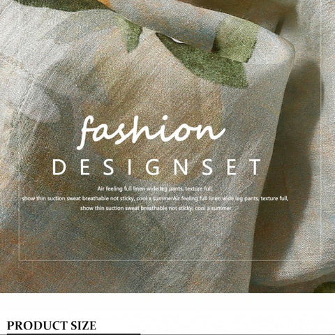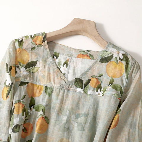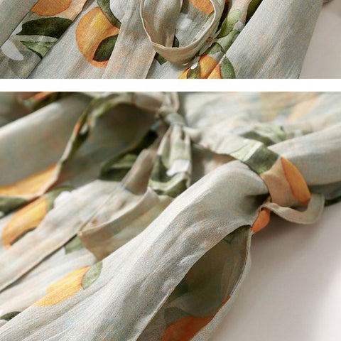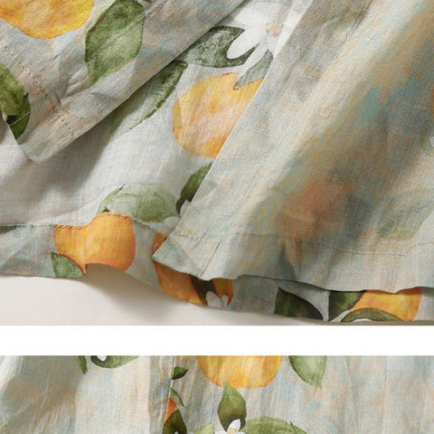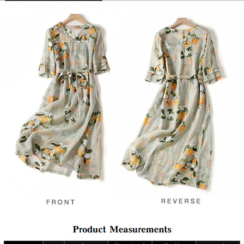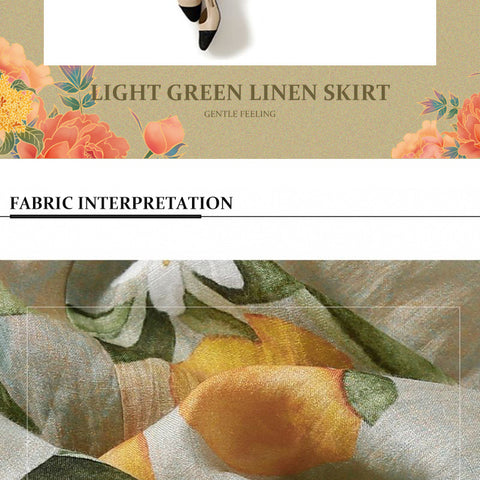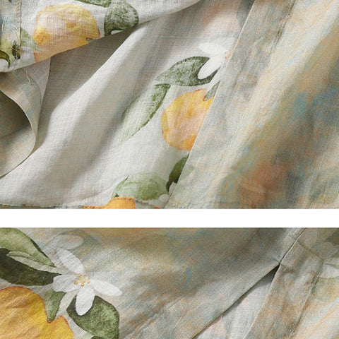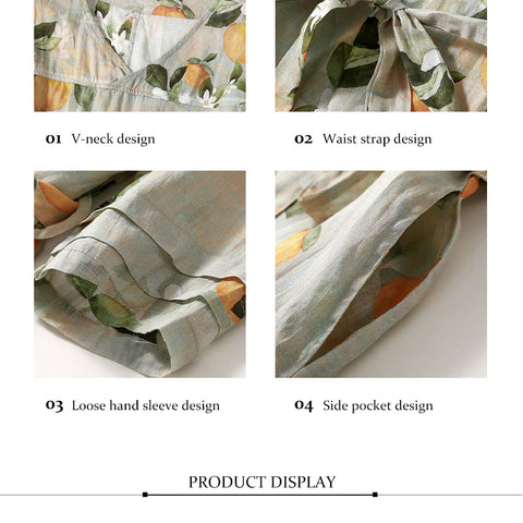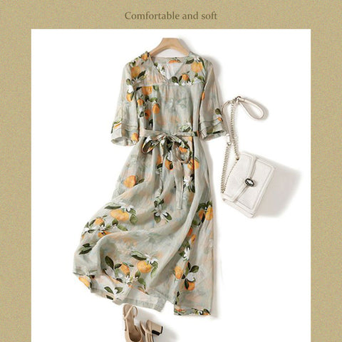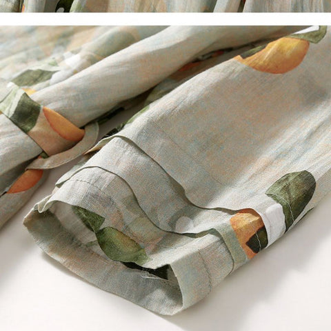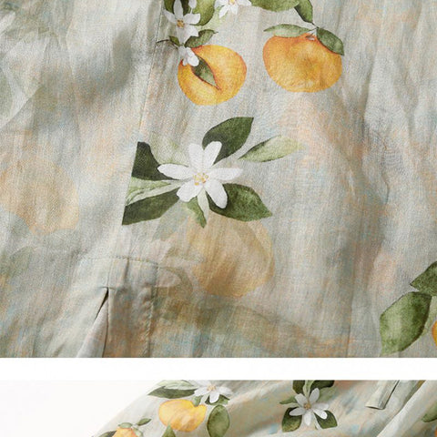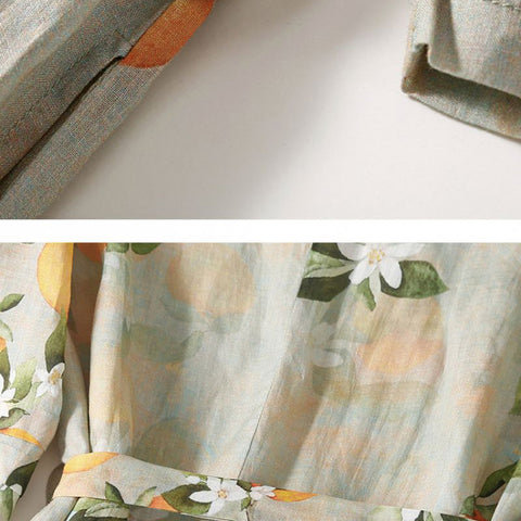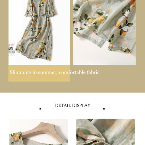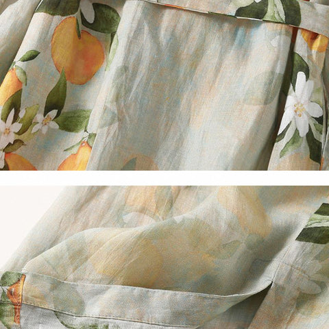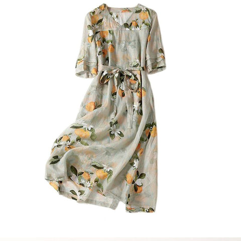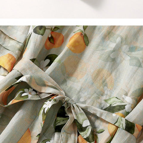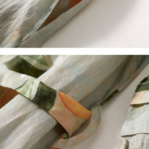 ライトグリーンのコットンリネンプリント半袖のワンピース