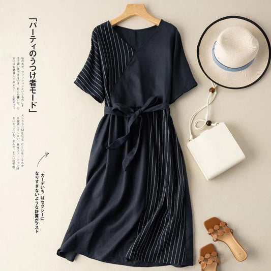 ライトグリーンのコットンリネンプリント半袖のワンピース
